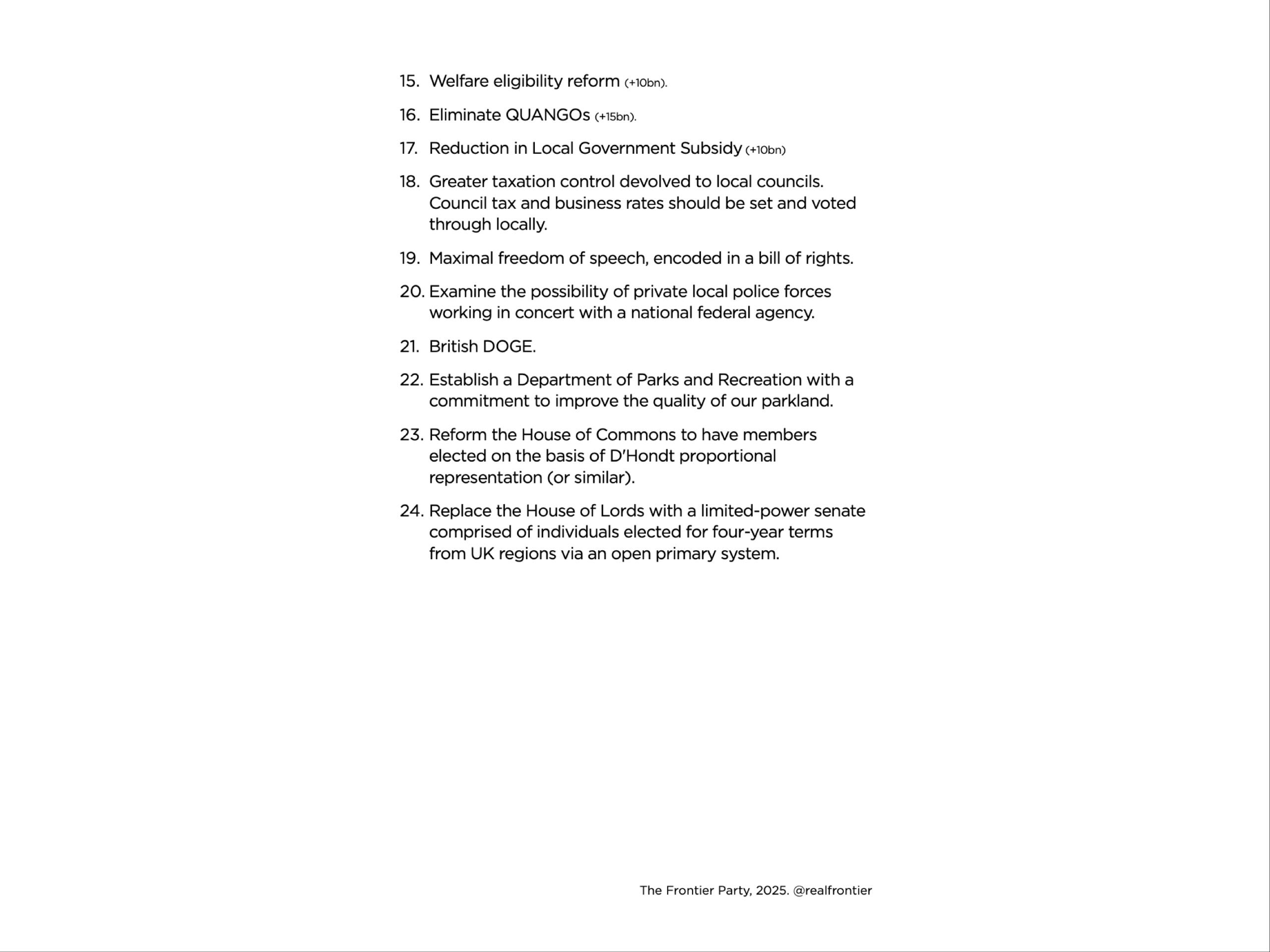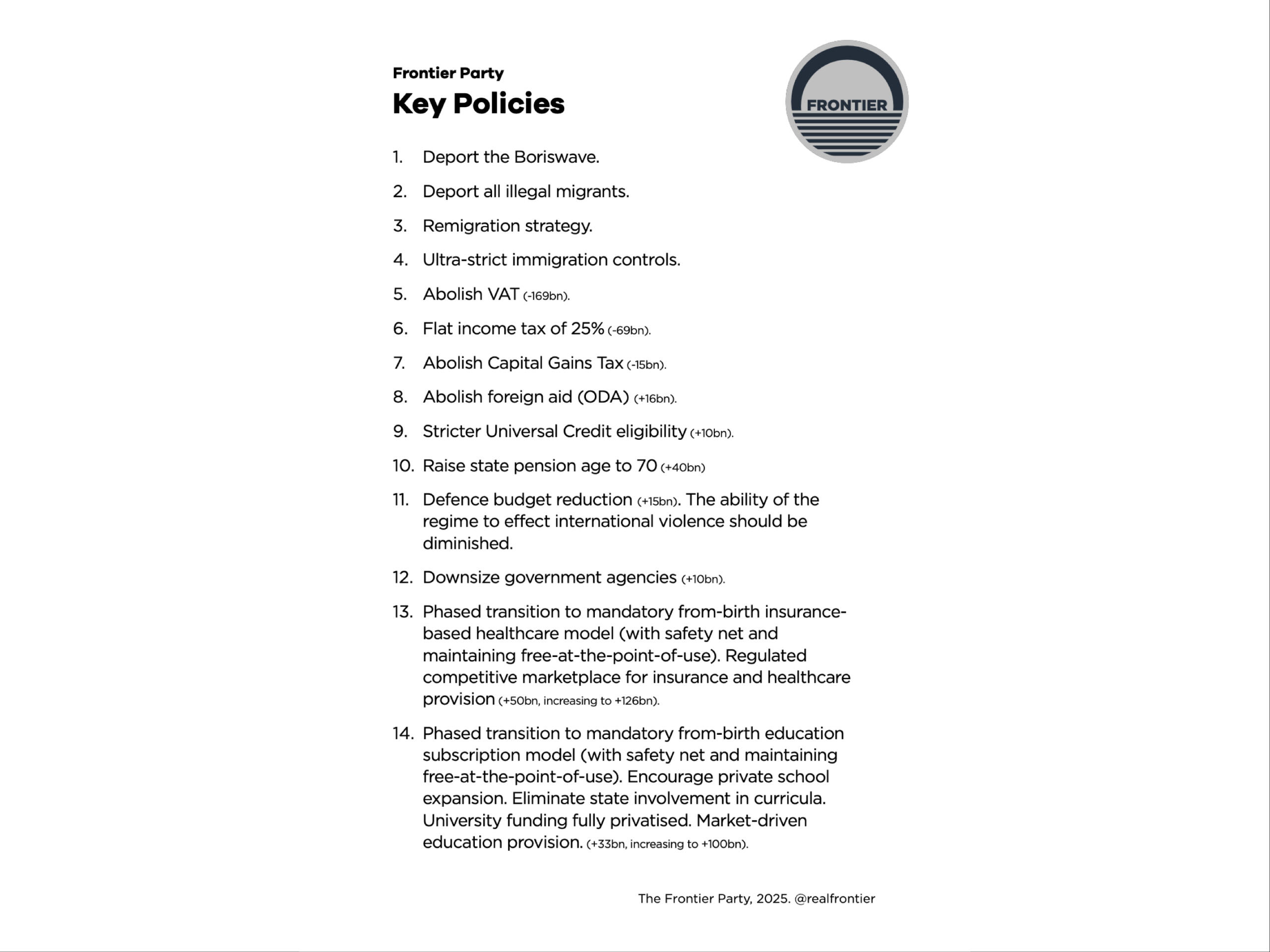Headline policies, including the abolition of VAT and capital gains tax and the introduction of a simplified flat income tax rate of 25%, will be largely funded through a phased withdrawal of the state from education and healthcare provision—while preserving a social safety net and ensuring services remain free at the point of use.A complete manifesto is under development.